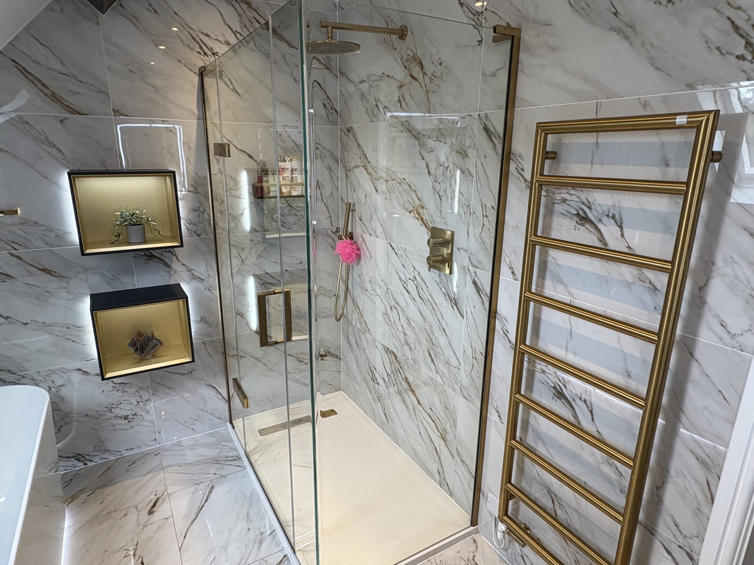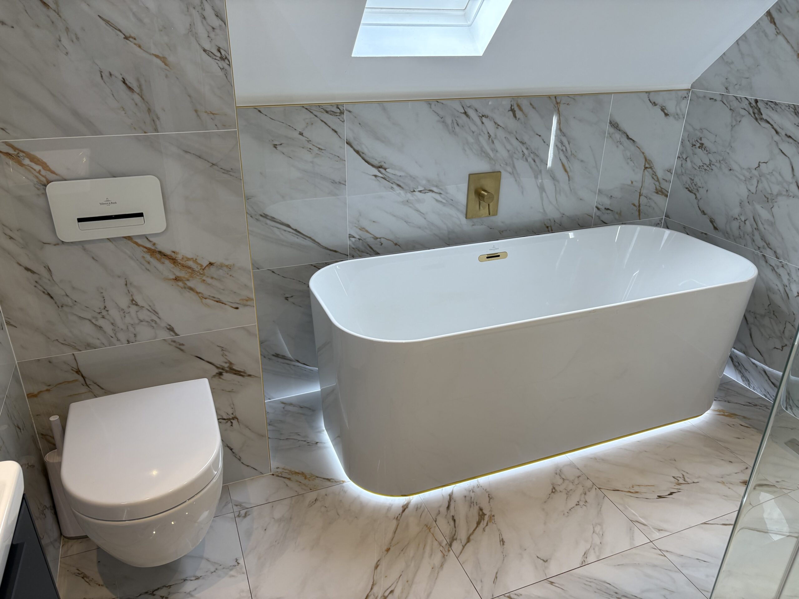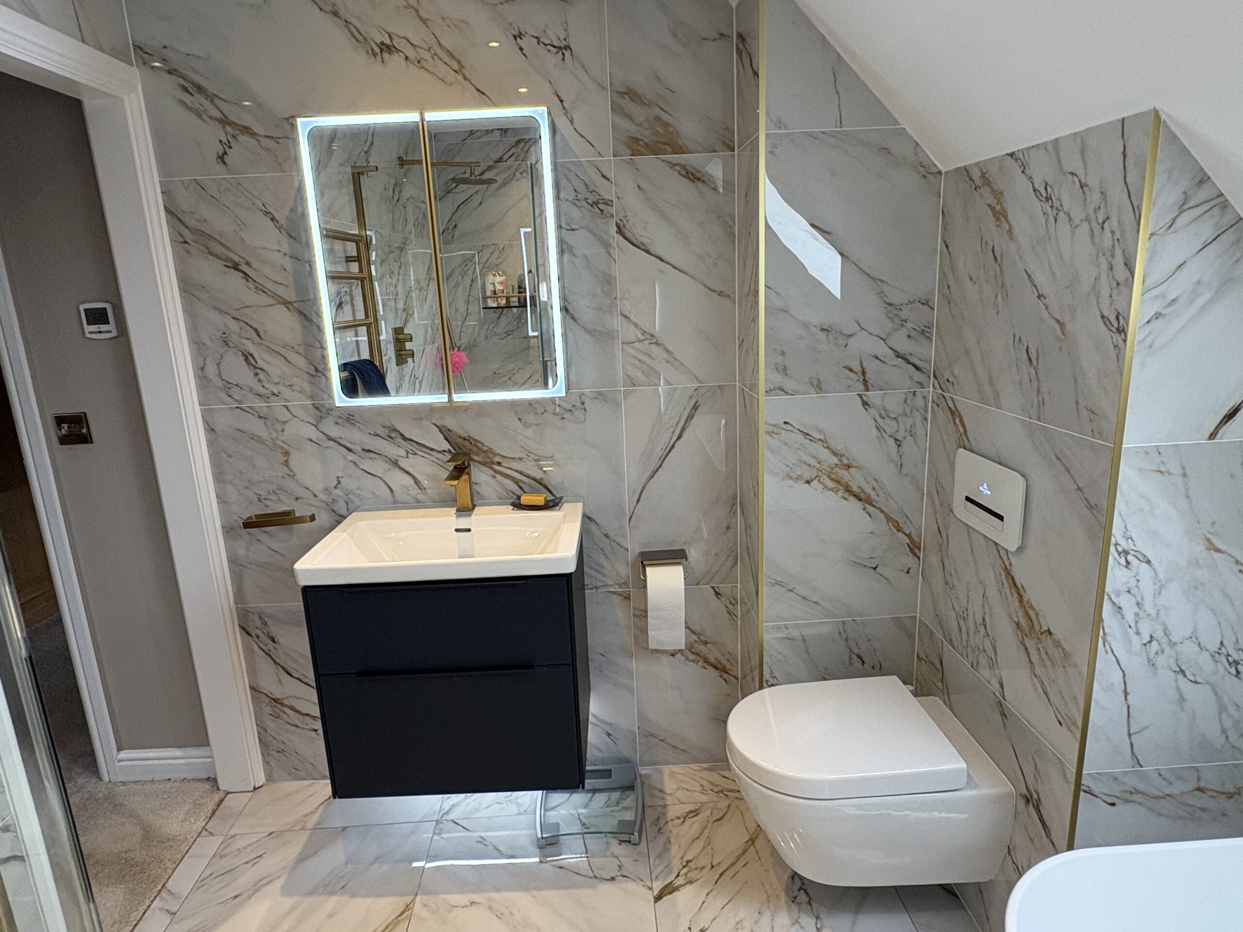 This project transforms an old en-suite into a modern, spa-like bathroom that balances luxury and functionality. The design maximizes natural light from the roof window and uses marble-effect tiles throughout for a seamless, elegant look.
