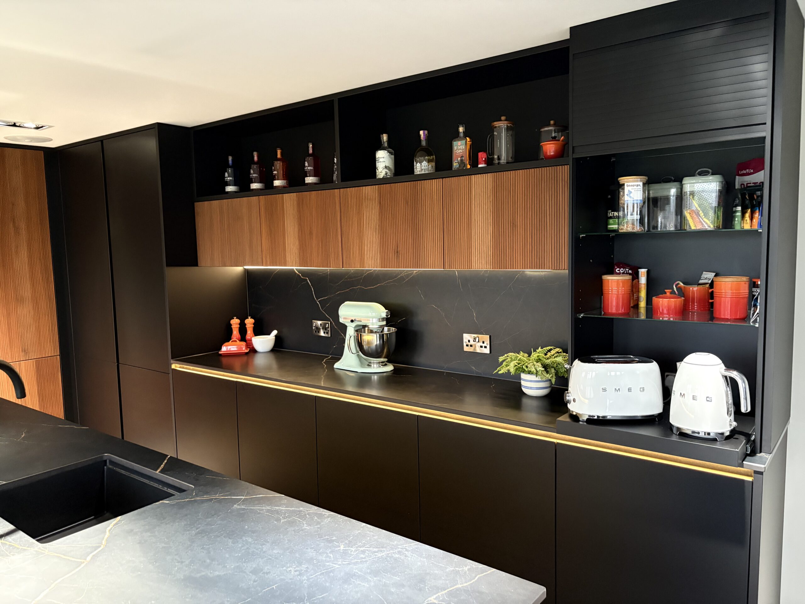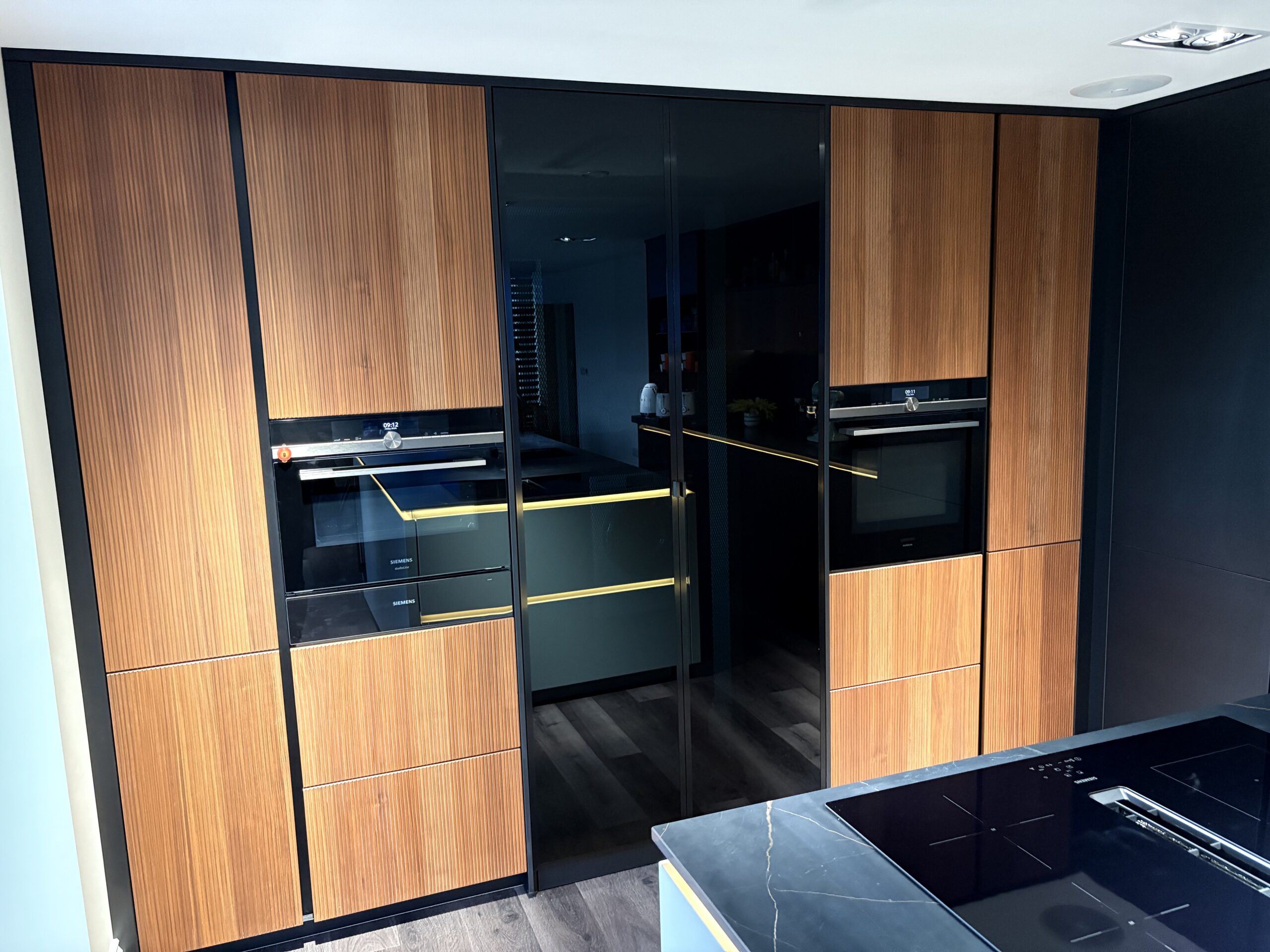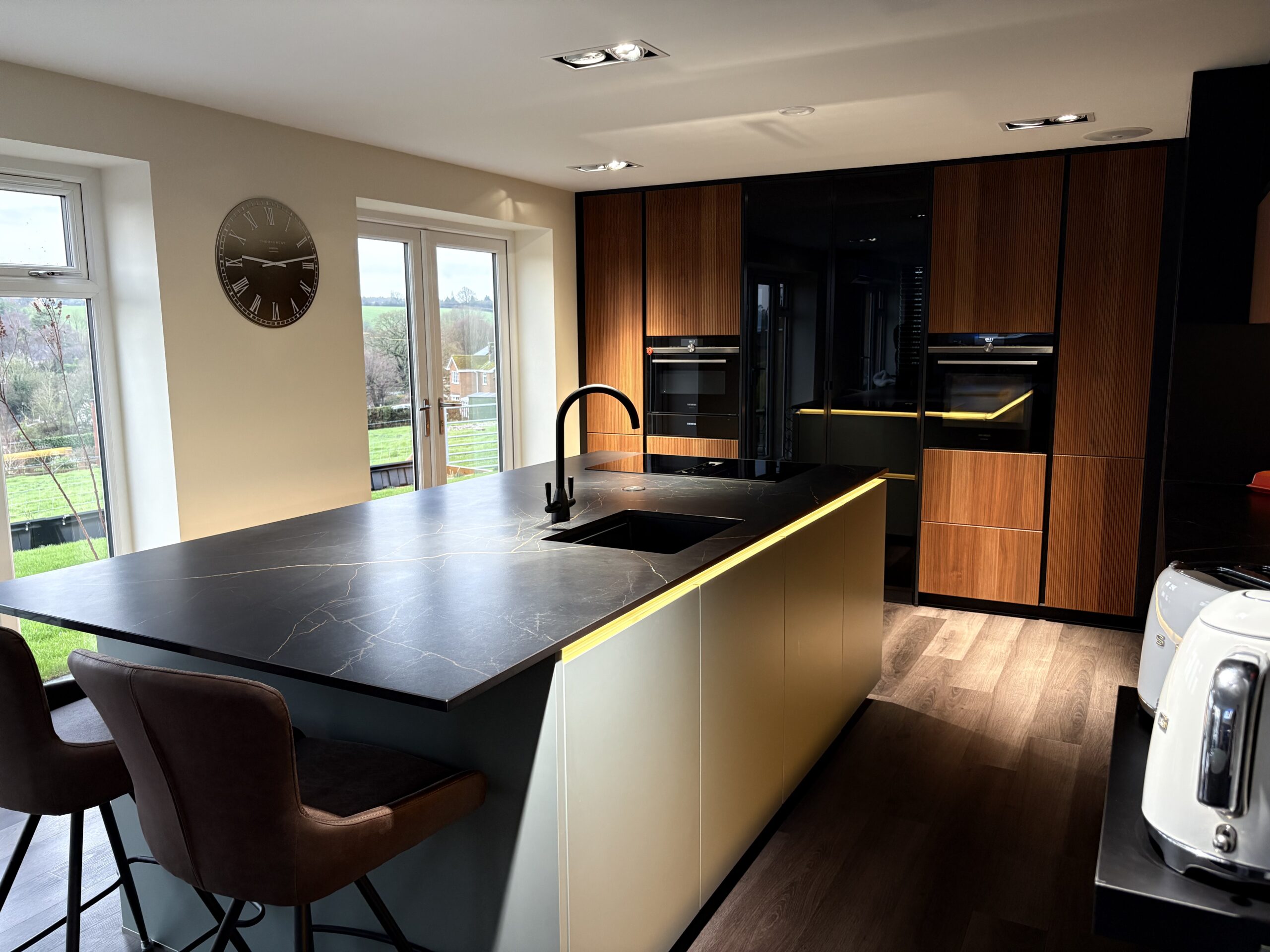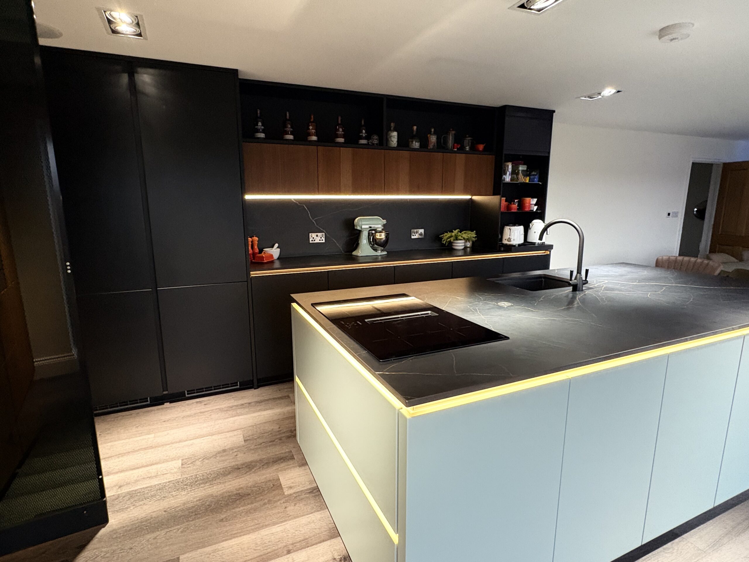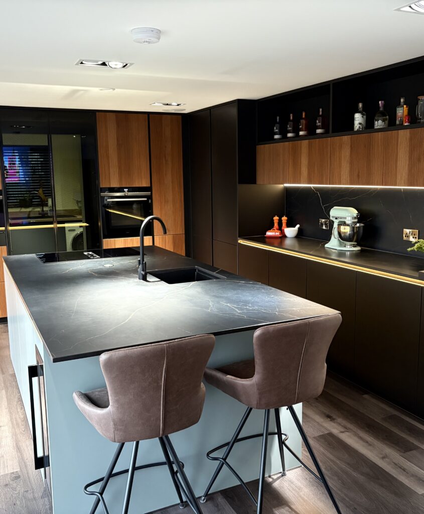 Matt black handleless cabinetry is paired with warm fluted timber-effect doors, creating contrast and visual depth. A large statement island with a dark stone-effect worktop provides generous workspace and seating, making it ideal for modern family living and entertaining. Integrated LED lighting enhances the cabinetry and adds a soft, ambient glow throughout the space.
