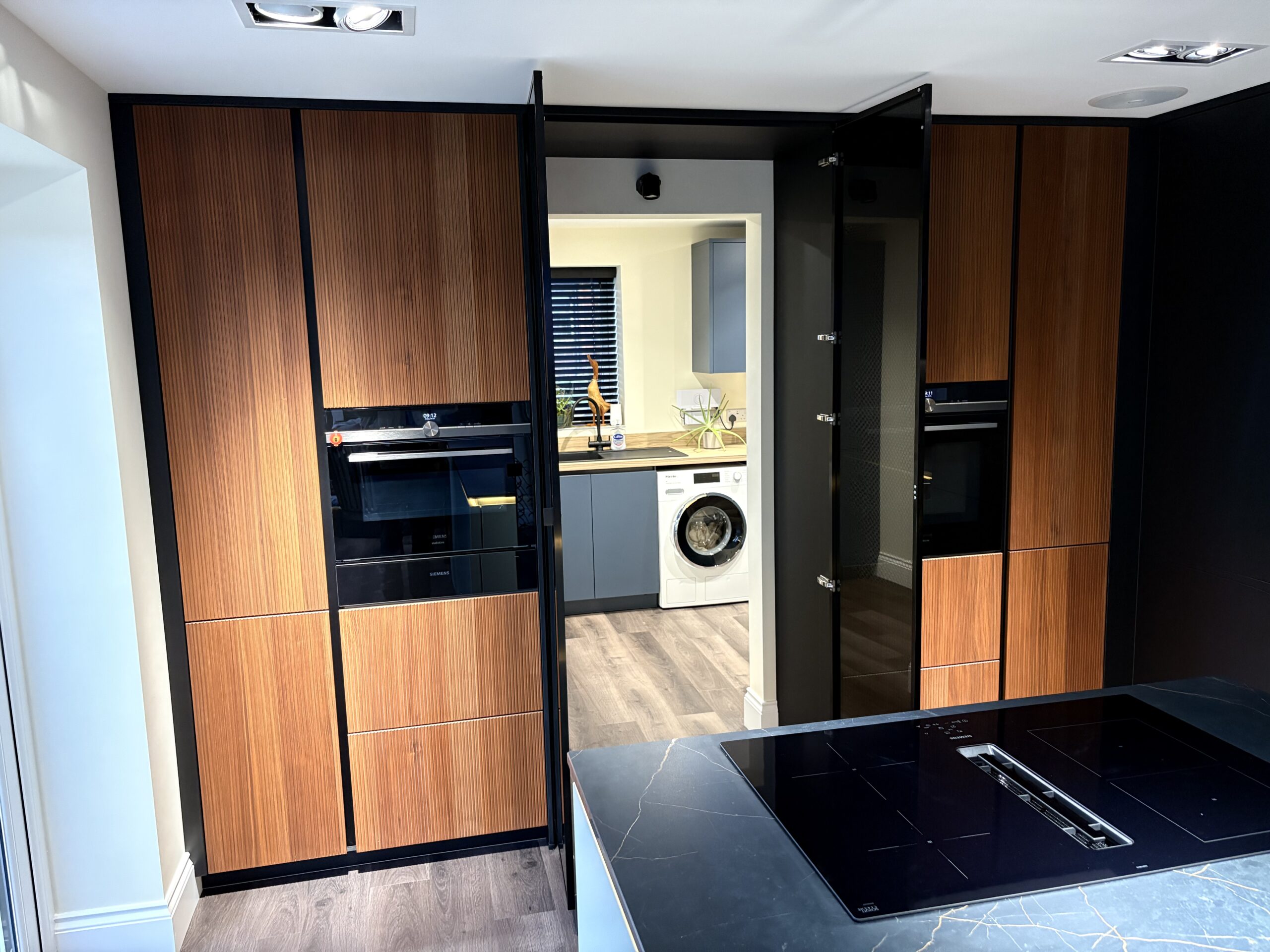 This project also showcases a thoughtfully designed utility room, seamlessly integrated and discreetly accessed through sleek black glass doors within the main kitchen.