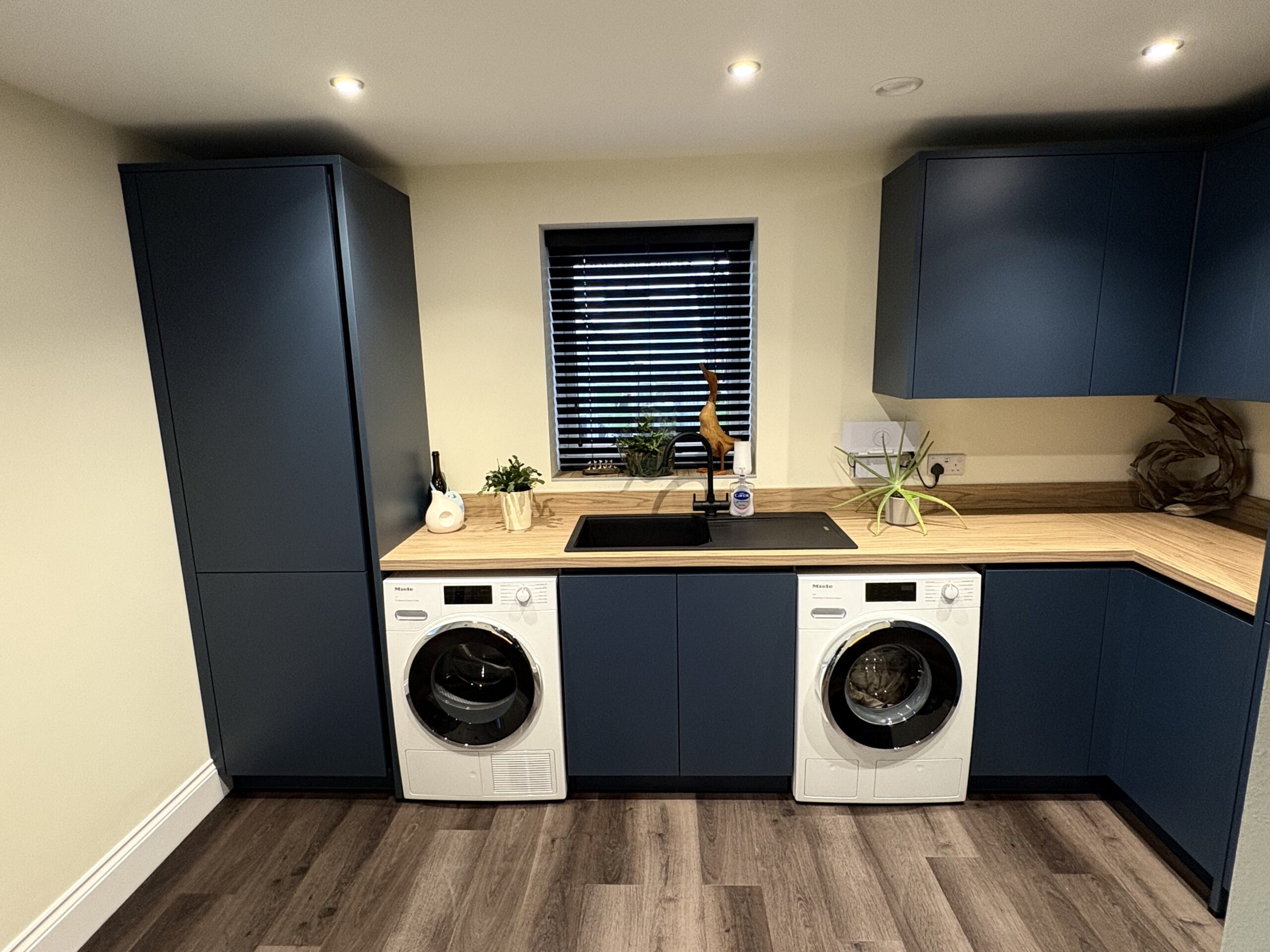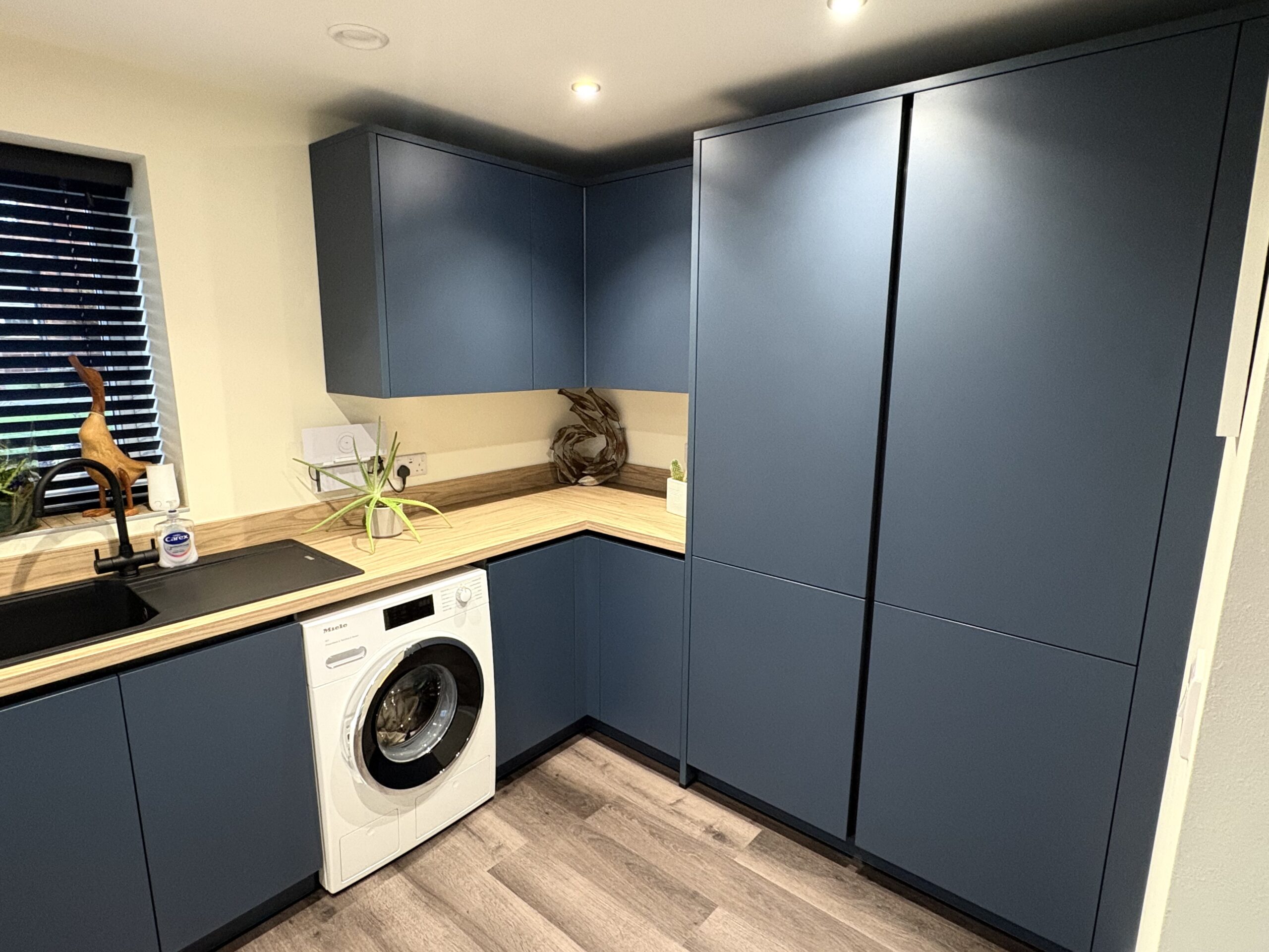 Behind the doors, the utility space is both highly practical and beautifully finished. Deep blue, handleless cabinetry provides generous storage while maintaining a calm, contemporary feel. Tall units maximise vertical space, allowing everyday appliances and cleaning essentials to be neatly concealed.