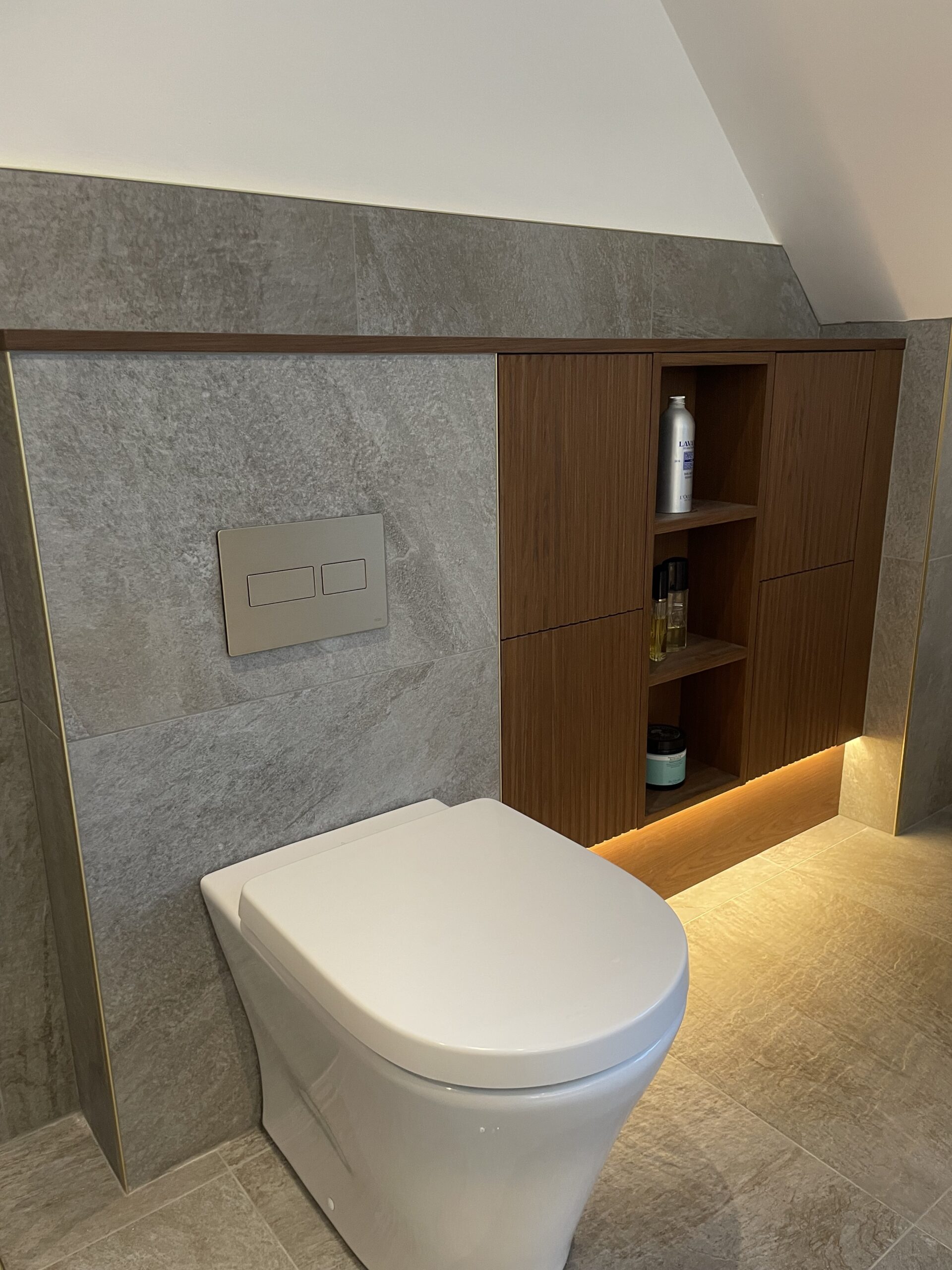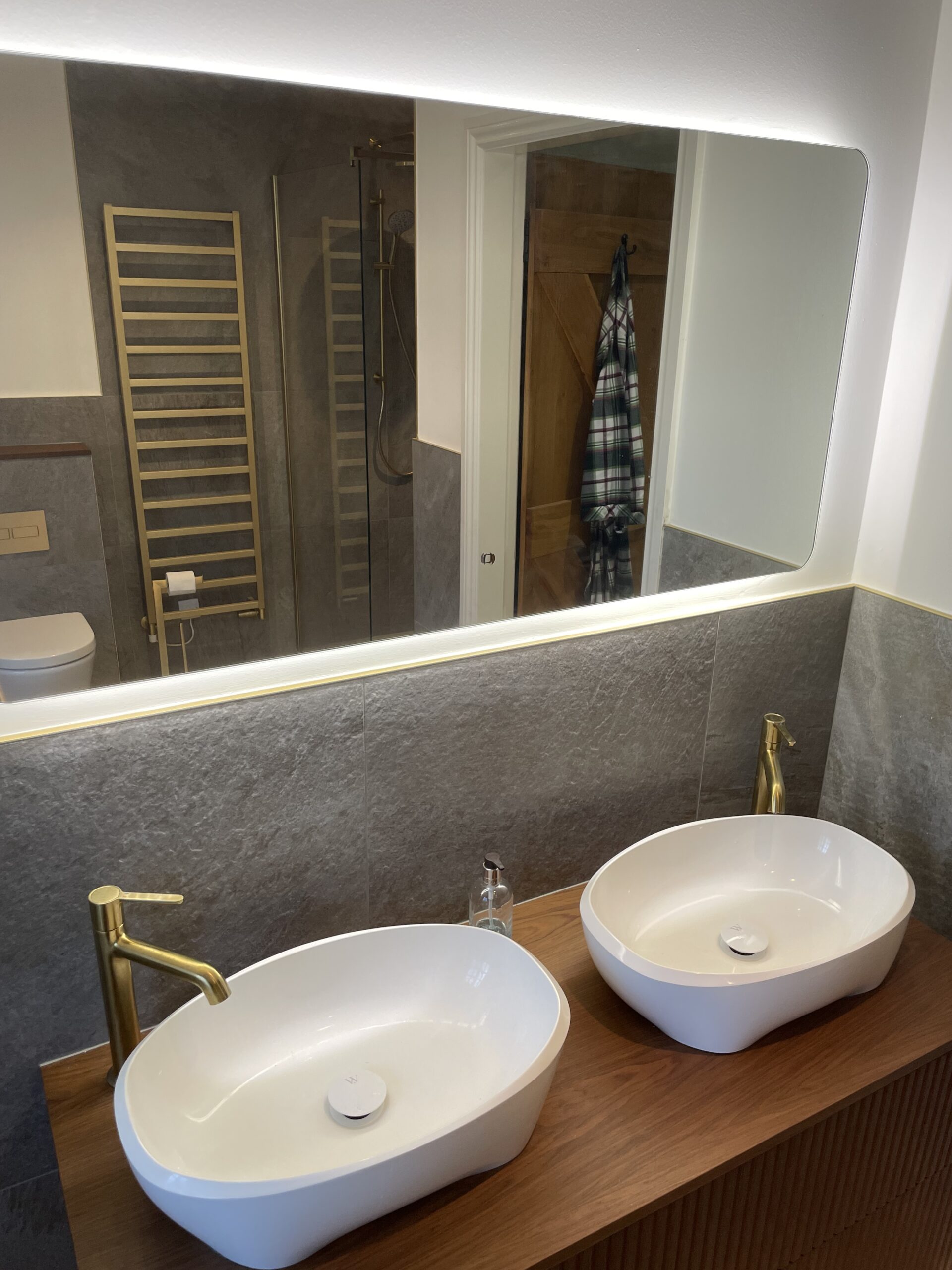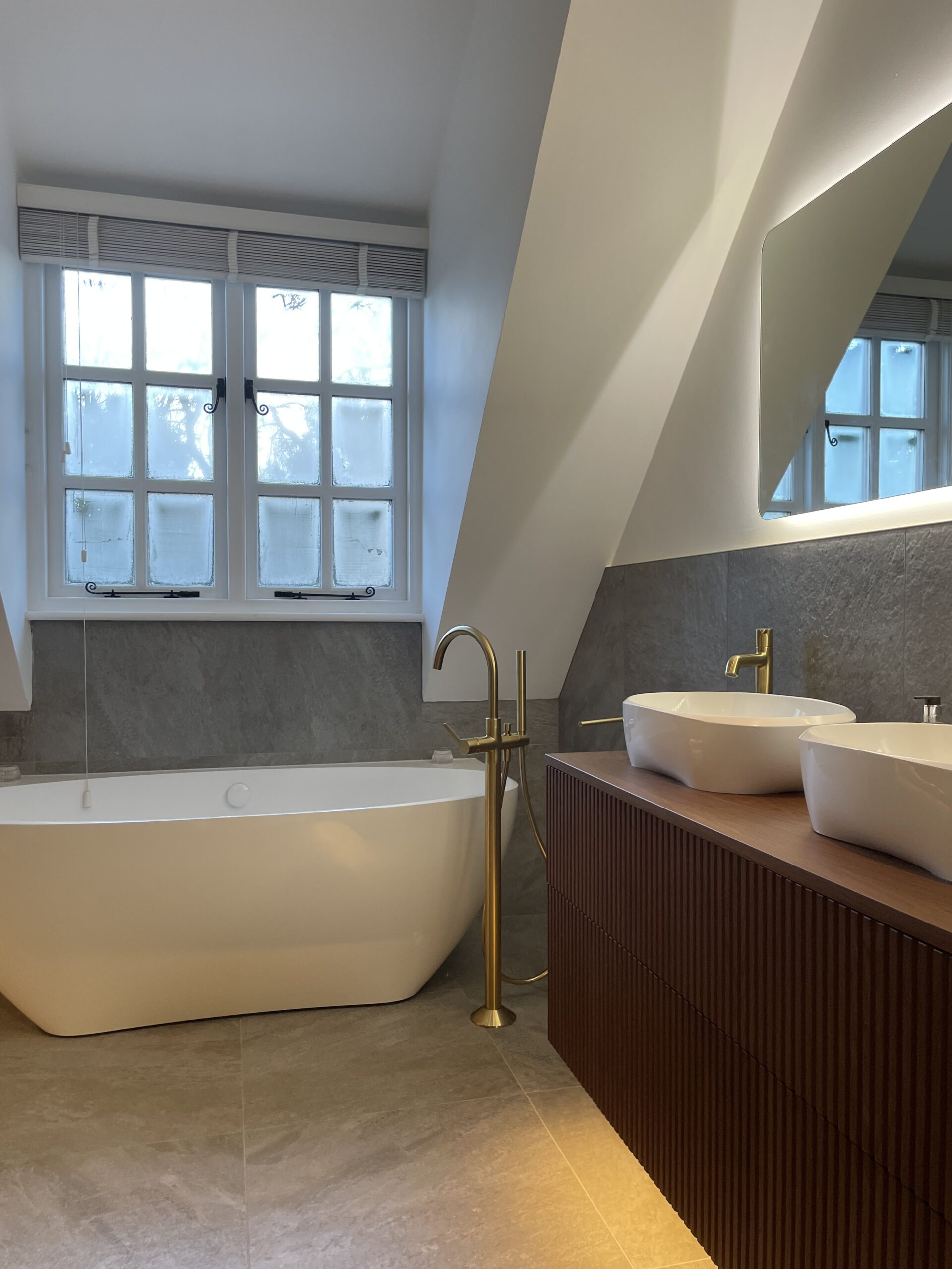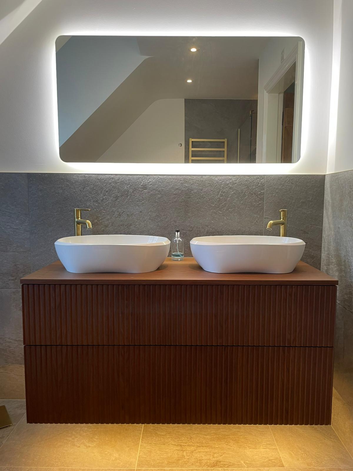 We designed a bespoke fluted walnut vanity unit with twin countertop basins and brushed brass taps, paired with large-format stone-effect tiles for a sleek yet inviting look. Subtle LED lighting beneath the vanity and behind the mirror enhances the ambience, while custom cabinetry, a wall-hung toilet, and a walk-in shower complete the sophisticated finish.